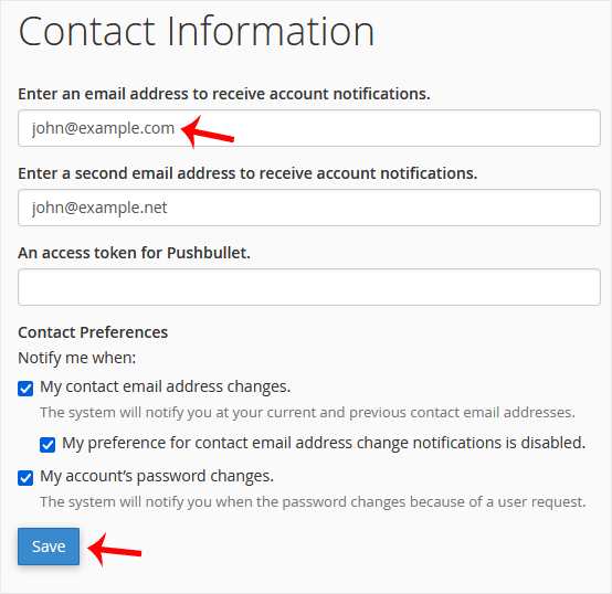 如需在达到磁盘配额、带宽使用限制时接收通知,或更新 cPanel 联系信息,请按以下步骤操作:
