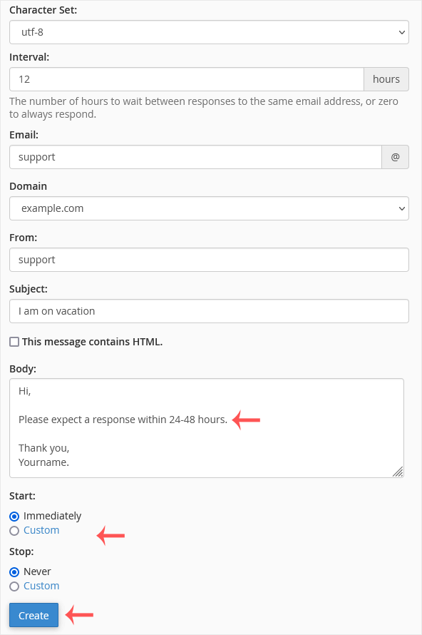 - 邮箱地址:输入需启用自动回复的邮箱前缀(如support)