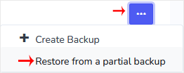 登录您的SiteWorx账户 在"备份"版块点击"管理" 3. 点击三点菜单图标并选择"从部分备份恢复" 4. 从下拉菜单中选择相应选项,点击"继续" 5. 点击"恢复"按钮。如需从本地上传部分备份文件,请选择"浏览"选取文件后确认恢复。