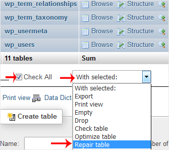 4.滚动页面,勾选 “全选”,然后点击下拉箭头并选择 “修复表”。